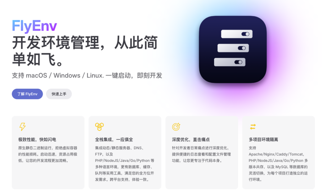 FlyEnv 是一款开源、跨平台(支持 macOS / Windows / Linux)的本地开发环境管理器。它不是 Docker,也不是虚拟机,而是一个原生静态二进制运行的轻量级工具,集成了 Web 服务器、数据库、编程语言运行时、缓存、队列、DNS、FTP 等几乎所有你开发时需要的组件。